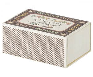 Se Duplican las tareas. Los bebés gemelos están recostados en su saco de dormir y vienen en una preciosa caja de cerillas decorada a mano. ¡Que comience la historia! Pertenecen a la colección de ratones de la prestigiosa y exclusiva marca danesa "Maileg", de estilo único y tradicional con acabados de exquisita calidad.